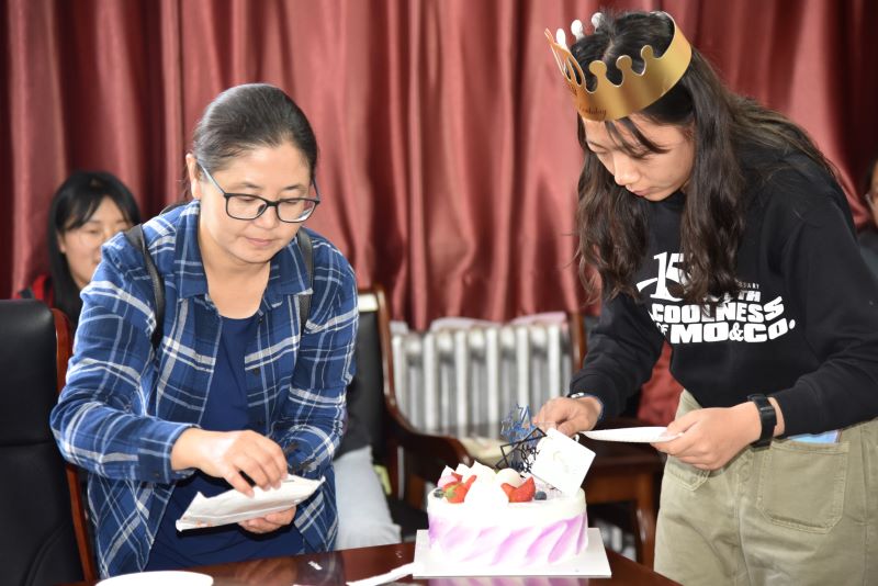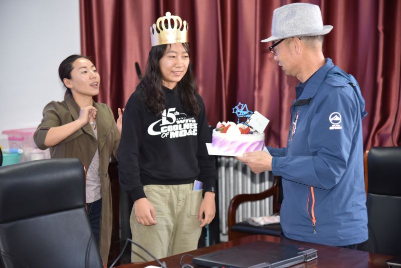 领导、老师特地为她准备了一份秘密惊喜,当姚书记说要为曹嘉桐同学庆祝生日时,嘉桐“受宠若惊”,对突如其来的惊喜深感意外,但随之而来的更多的是感动和无法言表的感激。当学院党总支书记白铁柱老师为她送上生日蛋糕,班主任乌木花老师和大家一起唱起《生日歌》时,曹嘉桐眼中泛起感动的泪花。随后,大家一起切蛋糕、送蛋糕、吃蛋糕,好一片其乐融融的热闹景象。