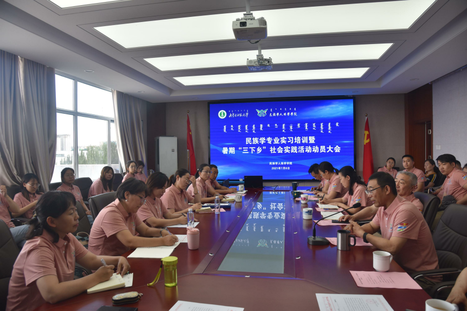 民族学专业实习培训暨田野调查动员大会在学院607会议室隆重召开。纳日碧力戈教授、党总支书记包凤兰、院长乌日陶克套胡、副书记副院长阿荣、赵树冈教授、系主任张昆、行政教辅老师、各带队教师、2019级民族学全体本科生及部分研究生参加了会议。会议由满达副院长主持。