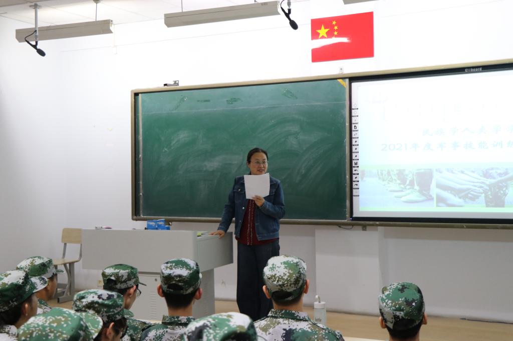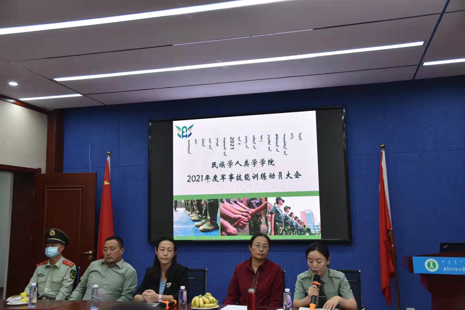 党委书记包凤兰、党委副书记阿荣、团总支书记朱苏道、学工办主任包双成、学工办老师姜鑫、班主任陈引弟、胡那斯图老师以及军训教官黄欢、张立,民人院全体2021级本科生。