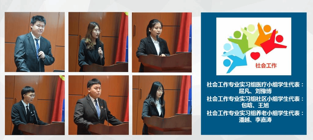 科左后旗小组郭婷婷、阿巴嘎旗组高瑞奇、乌拉特后旗组王晓柔、社会工作专业实习组医疗小组屈凡和刘豫博、社会工作专业实习组医疗小组包含和王旭、社会工作专业实习组养老小组潘越和李嘉涛等9位学生代表汇报田野调查及专业实习情况。