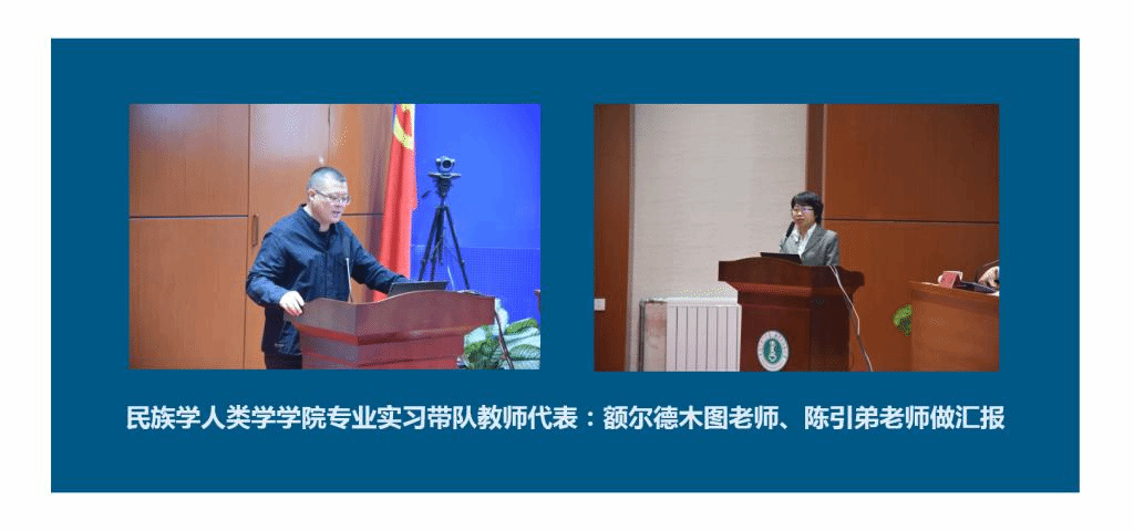 由田野调查指导老师代表额尔德木图和社会工作专业实习指导老师代表陈引弟汇报田野调查及专业实习情况。