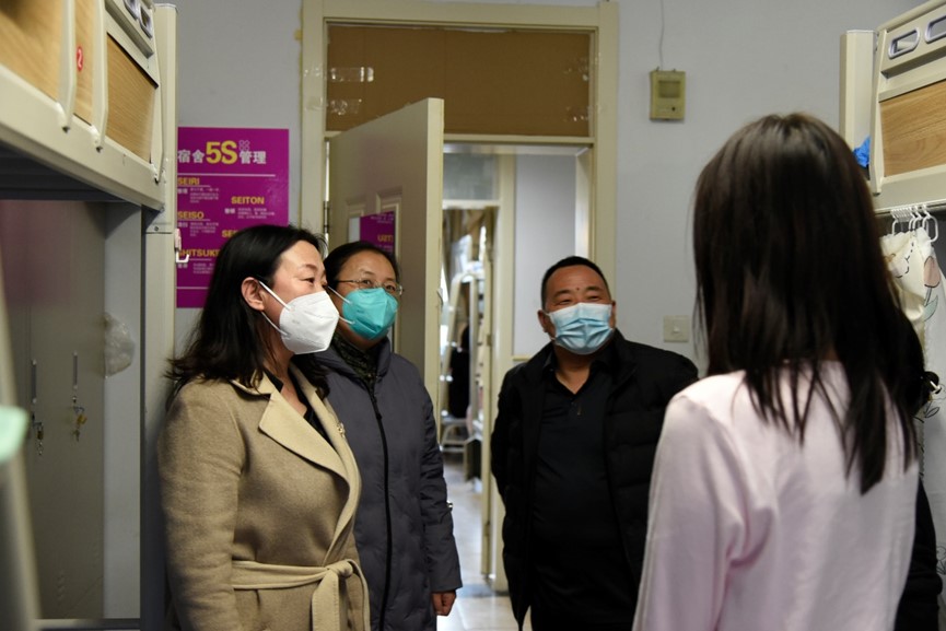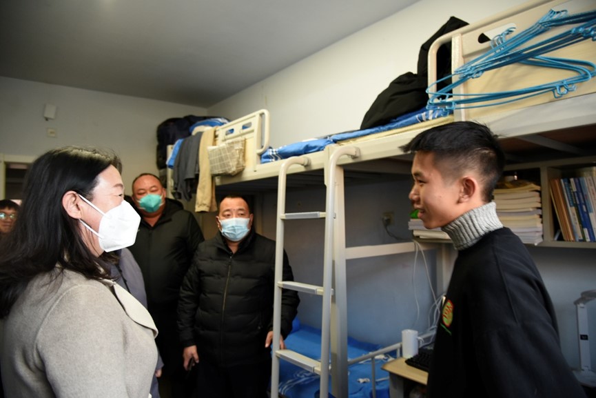党委书记包凤兰,学院副书记、副院长阿荣,团总支书记姜鑫,学工办主任包双成一同走访学生宿舍看望返校学生。