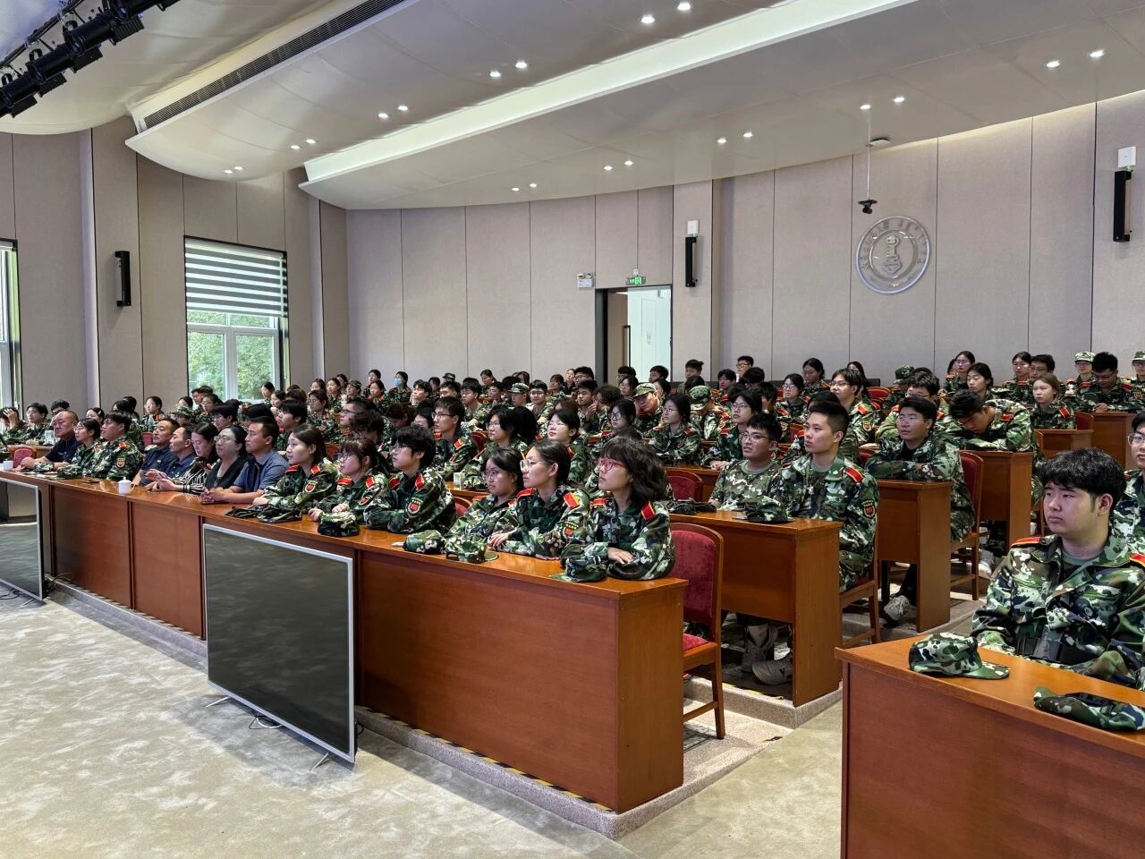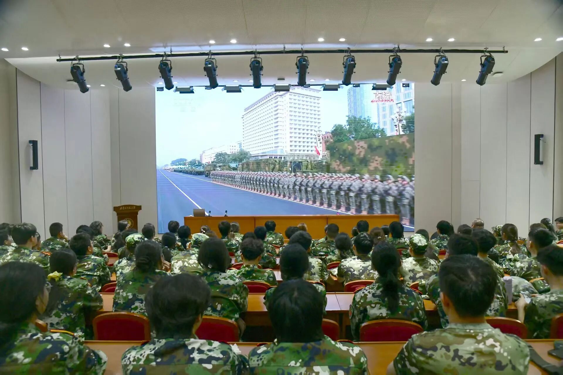 当礼炮轰鸣、国旗护卫队迈着铿锵步伐走向升旗区时,报告厅内师生全体肃立,目光追随着五星红旗冉冉升起,心中满是对先烈的崇敬与对祖国的热爱。阅兵式上,威武的方阵、先进的装备、昂扬的士气,不仅展现着新时代中国的国防实力,更传递出中华民族铭记历史、守护和平的坚定决心,让在场师生深受震撼与鼓舞。