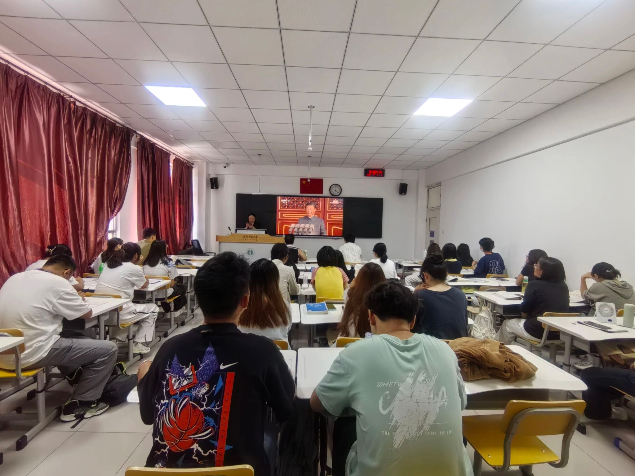 学院高度重视此次活动,学院党委书记包凤兰、副书记副院长陆一琼、副院长满达、团总支书记姜鑫、学生工作与就业办公室主任包双成、辅导员宋小波等与大一新生在信息楼报告厅共同见证这一庄严时刻。其他年级同学则以班级和宿舍为单位,通过网络平台同步收看,让每一位师生都能融入这一特殊的历史教育场景。