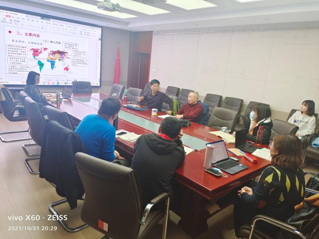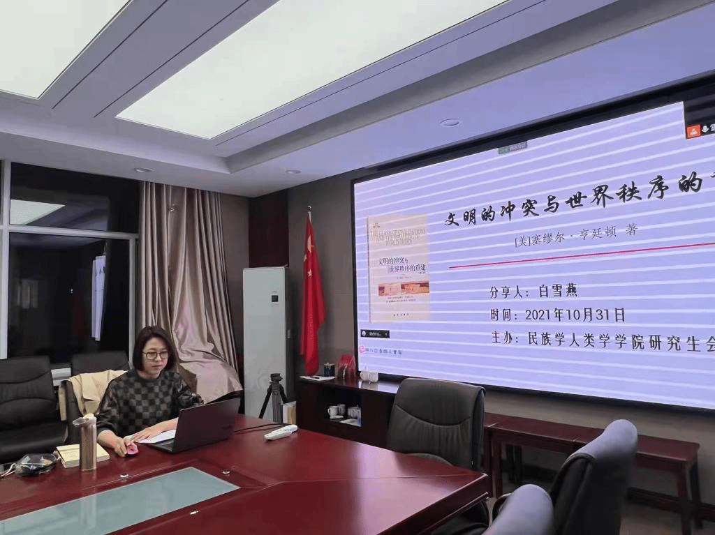 21级博士研究生第2期读书报告会于2021年10月31日晚19点在田楼607会议室举行,21级博士研究生全员参加本次报告会。本次读书报告会采取线上和线下两种方式同时进行,方便校内校外住宿的同学一并参与学习讨论。本次读书报告会的汇报书目是《文明的冲突与世界秩序的重建》,主讲人为马克思主义民族理论与政策专业博士研究生白雪燕同学。