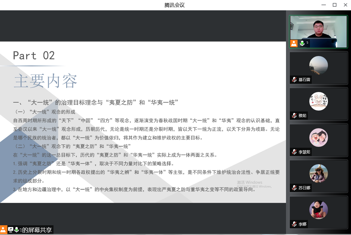 德力海同学分享的论文是《从国家治理的角度思考中国历史上的“华夷”与“大一统”》,(《清史研究》2021年第4期)一文。分享者首先介绍了论文作者等基本概况,然后对论文的主要内容进行了详细的介绍,从国家治理的角度看,中国历史上的"大一统"既是最主要的治理目标理念,也是历代治理体系的重要内容。中国历史上各民族政治、经济和文化的紧密联系,为多民族的"大一统"观念和格局奠定了基础。在“大一统”观念和格局下多民族之间的互动与治理方式的借鉴吸收,则成为中国历史上统一多民族国家不断发展巩固、治理体系不断完善的重要动力。分享者并从问题意识中入手向各位同学分享自己的阅读感想,同时拓展自己研究思路、引发论文写作的思考,值得肯定。
